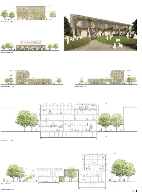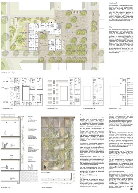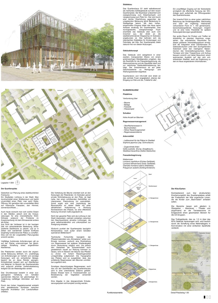 Die Hauptnutzungen des Quartiershauses Q1 sollten eine 6-gruppige Kindertageseinrichtung mit U3- und Ü3-Bereich sowie ein Quartierstreff sein, ein Treffpunkt mit multifunktionalen Räumlichkeiten für den Stadtteil. Beide Nutzungen sollten baulich getrennt geplant werden, Raumsynergien waren aber teilweise möglich. Insgesamt umfasste das Raumprogramm des Quartiershauses eine BGF von etwa 2.700 qm. Das Quartiershaus soll der wichtigste Anlaufpunkt für die Stadtteilarbeit und die Pioniere von Dietenbach werden. Es sollte deshalb inklusiv und als klimaneutraler Neubau in Holz-/Holzhybridbauweise errichtet werden. Seine hohe repräsentative Bedeutung und seine gewünschte Strahlkraft auf nachfolgende Projekte in Dietenbach, sollten bei der Konzipierung berücksichtigt werden. Wichtig war vor allem auch die Schnittstelle zwischen Hochbau und Freiraum. Zu der Aufgabe gehörte die Planung der rund 1.100 qm großen Kita-Außenfläche und des dem Quartiershaus vorgelagerten und im Kernbereich rund 1.700 qm großen Quartiersplatzes. Dieser soll künftig Teil des Viertels und zu seinem städtebaulichen und sozialen Herzstück werden. Dabei sollte bei seiner Gestaltung die wichtige nachbarschaftliche Funktion als Begegnungs- und Erholungsraum berücksichtigt werden und diese auch zur Identifikation und Aneignung beitragen.