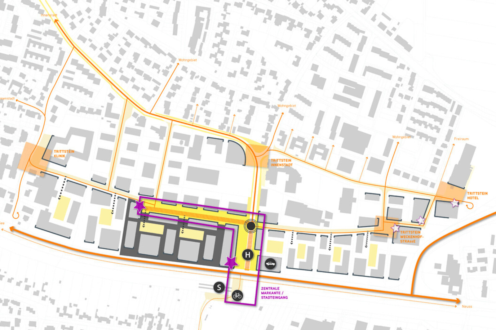 Ein weiterer wichtiger Aspekt des Konzeptes ist die Entwicklung eines angemessenen `Stadteingangs`. Ausgehend von dem S-Bahn-Haltepunkt über die Neersener Straße führt ein neuer, offener und attraktiv gestalteter `Eingang` als besondere `Adresse` in das Gewerbegebiet. Funktionalität und Offenheit im öffentlichen Raum sind hier wesentliches Gestaltungselement. Baulich und Funktional sollte hier ein besonderer Akzent gesetzt werden.
