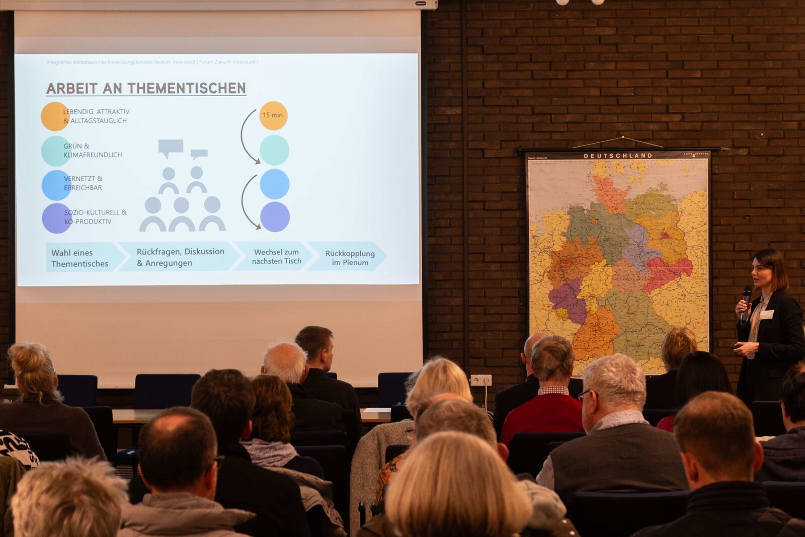 Zu Beginn wurden das Integrierte Handlungs- und Maßnahmenkonzept (IHMK) von 2012 sowie die aktuelle Ausgangslage der Innenstadt umfassend evaluiert. Eine systematische Bestandsaufnahme (u. a. Nutzungen, Freiräume, Mobilität, Klimaresilienz, Soziales, Wirtschaft) sowie eine SWOT-Analyse verdichteten Stärken, Schwächen, Chancen und Risiken. Daraus wurden strategische Handlungsbedarfe sowie identifizierte Leitziele und erste Suchräume für prioritäre Maßnahmen abgeleitet. Im Nachgang an diese intensive Evaluations- und Analysephase wurden in dem weiteren Prozess gezielt verschiedene Beteiligungsformate für einen intensiven Dialog eingesetzt: eine Verwaltungswerkstatt mit den fachlich zuständigen Ressorts der Stadt Beckum, zwei öffentliche Foren „Zukunft Innenstadt Beckum“ sowie eine begleitende Online-Beteiligung, um Hinweise der Stadtgesellschaft systematisch aufzunehmen. Die Ergebnisse aus Verwaltung, Öffentlichkeit und Online-Dialog flossen in die Bestandsanalyse, die Ableitung von Handlungsfeldern und Zielen sowie in die Maßnahmenentwicklung ein.
