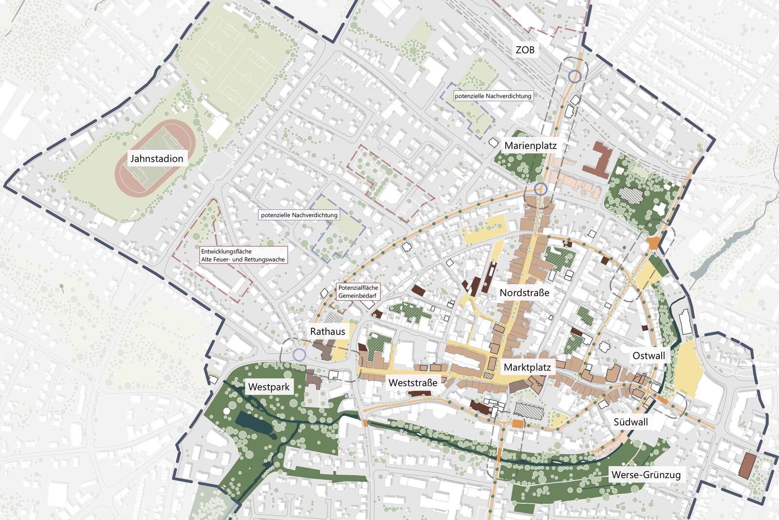 Auf dieser Grundlage entstand ein stadträumliches Konzept als langfristige Vision (Zeithorizont 15 Jahre). Es schafft einen integrierten Blick auf eine städtebaulich wünschenswerte Entwicklung der Innenstadt, dient als Entscheidungsgrundlage und bleibt bewusst flexibel, um auf veränderte Rahmenbedingungen reagieren zu können. Aus der Vision wurde – gemäß den neuen Förderrichtlinien Stadterneuerung NRW 2023 – ein kompaktes, umsetzungsorientiertes Maßnahmenpaket für die nächsten 7–10 Jahre definiert, das priorisierte Kernmaßnahmen mit hoher Realisierungswahrscheinlichkeit bündelt.