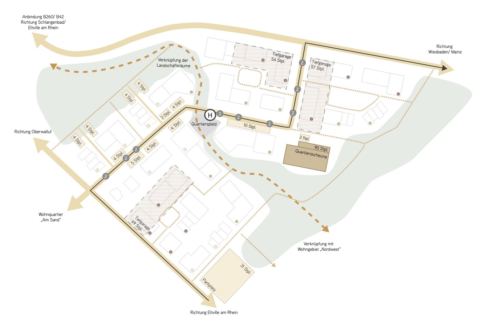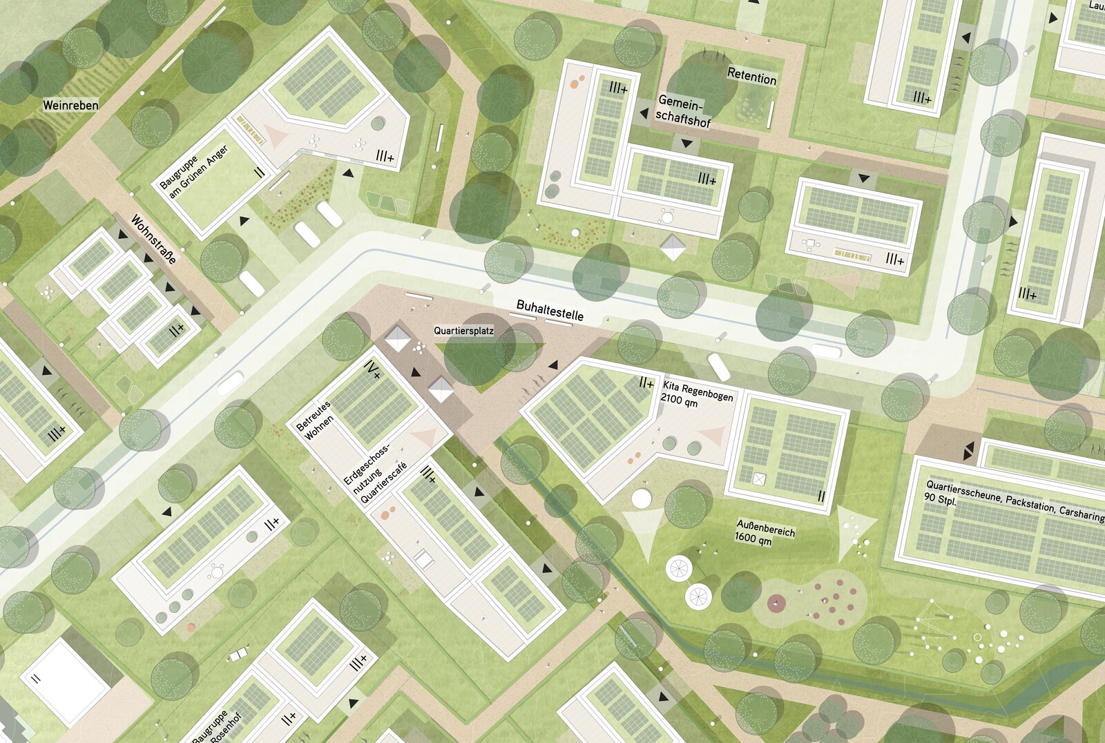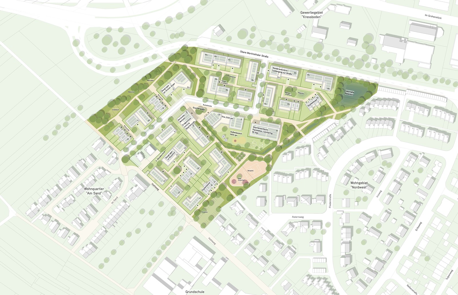 Das neue Quartier zeichnet sich durch seine lebendige Mischung der verschiedenen Wohnungstypen aus, die einerseits gemeinschaftsbildenden Höfen und andererseits in arrondierenden linearen Strukturen angeordnet sind. Wesentliches Rückgrat des neuen Quartiers und damit zentrales und profilbildendes Element ist ein mäandrierend verlaufender Landschaftsraum, der vielseitig nutzbar ist und einerseits das Quartier nach Nordwesten in den Landschaftsraum öffnet. Andererseits bildet er in südöstliche Richtung einen zentralen Bereich mit wohlproportioniertem Quartiersplatz aus und verläuft zusammen mit dem Außenbereich der Kita Regenbogen in einen Grünbereich unterhalb der Stromtrasse, der die Anknüpfung an das Wohngebiet „Nordwest“ bildet und gemeinschaftliche Freiraumnutzungen aufnimmt. Der zentral liegende Quartiersplatz bildet eine keilförmige Geste, die sich in Richtung Osten öffnet. In Verlängerung des Keils befinden sich Allmendenutzungen wie Kita, betreutes Wohnen, naturnahe Aufenthaltsflächen und die Quartiersgarage.